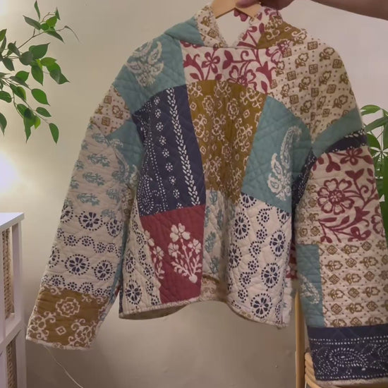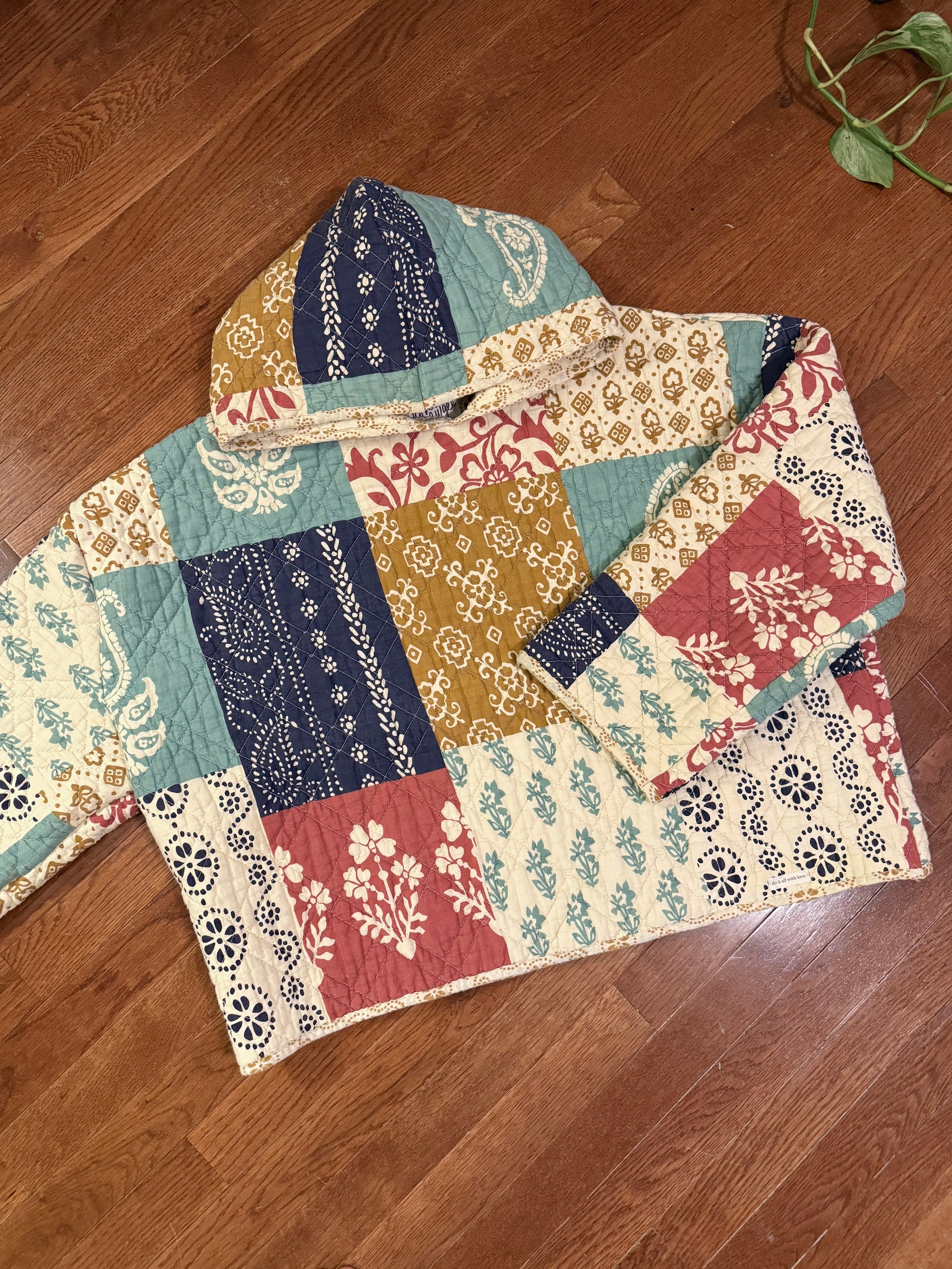 upcycled hoodie made from a salvaged quilted blanket. soft + warm !